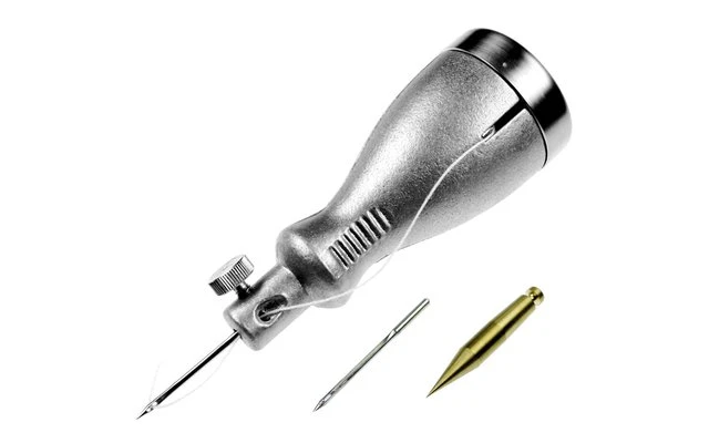 Komplett mit einem Satz Nadeln und Garn, unverlierbar im Heft der Ahle untergebracht.